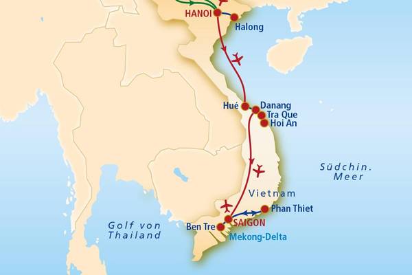 - Linienflüge mit Vietnam Airlines (oder gleichwertig, Umsteigeverbindung möglich) ab/bis Frankfurt nach Hanoi und zurück von Ho-Chi-Minh-Stadt